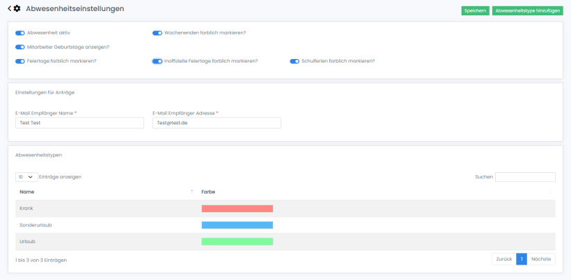 Die Einstellungen der Abwesenheitsverwaltung ist in drei Bereiche aufgeteilt. Auf dieser Seite werden die oberen zwei Bereiche beschrieben. Die Abwesenheitstypen werden auf der nächsten Seite erklärt.