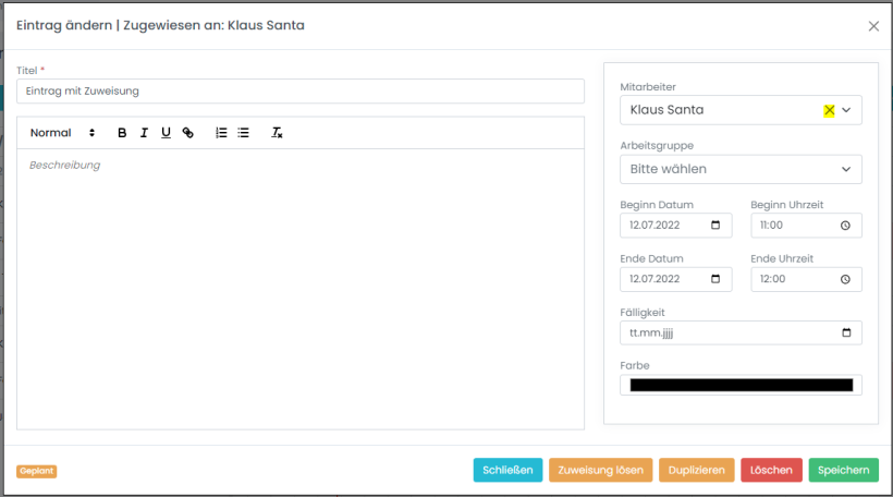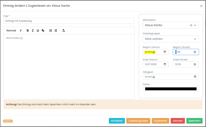 Bei dieser Art des Lösens, bleibt die Zuweisung und der Zeitraum in dem Eintrag erhalten trotz dass der Eintrag nicht mehr auf dem Kalender zusehen ist.