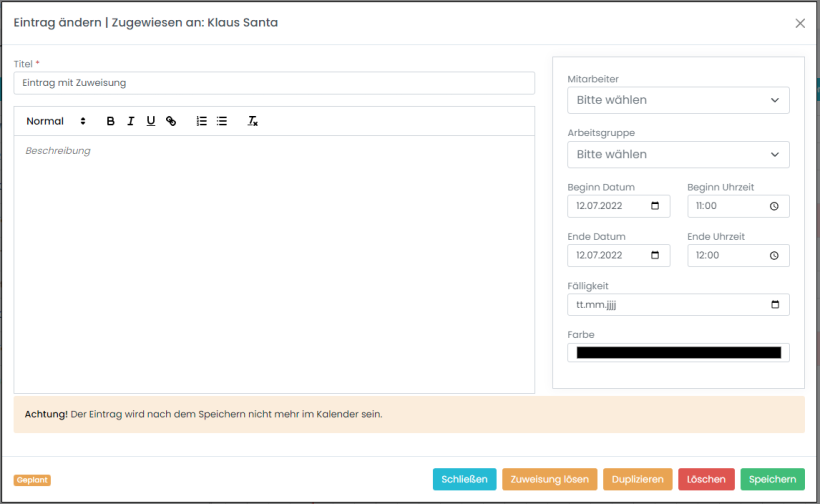 Das System weist Sie direkt daraufhin, dass die Zuweisung nach dem Speichern aufgehoben ist und der Eintrag nicht mehr im Kalender zusehen ist.