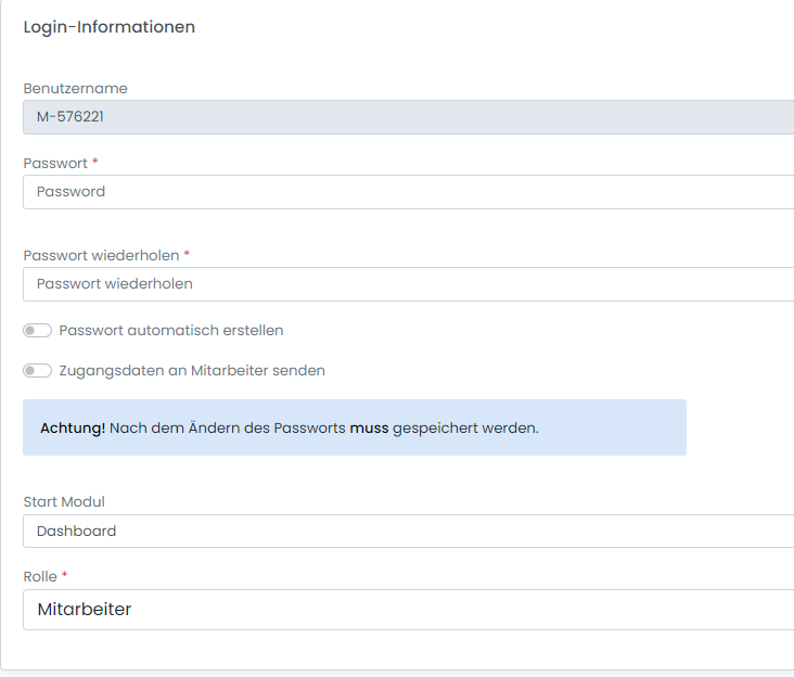 Sie können jetzt ein neues Passwort vergeben. Sie können aber auch das Passwort automatisch vom System setzen lassen. (Empfohlen) Mit der Option "Zugangsdaten an Mitarbeiter senden" wird, nach dem Speichern, das neue Passwort an den jeweiligen Mitarbeiter gesendet. Nach der Änderung müssen Sie Speichern, sonst wird das neue Passwort nicht übernommen.